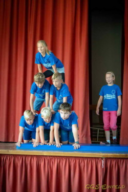 Unter der Anleitung der Schulassistentin Dorina Harbs lernten die Kinder des zweiten Jahrgangs das Musical „Der Regenbogenfisch“. Die kostenlose Aufführung fand in der Mehrzweckhalle der Grund- und Gemeinschaftsschule Einfeld statt. Beeindruckend waren neben dem Gesang auch die Kostüme und das gesamte Bühnenbild, das die Kinder mitgestaltet hatten. Die Hauptrolle hatte Lina Mossakowski, die den Regenbogenfisch spielte. Sie erhielt am Ende der Vorstellung einen besonders großen Applaus für ihre Leistung.